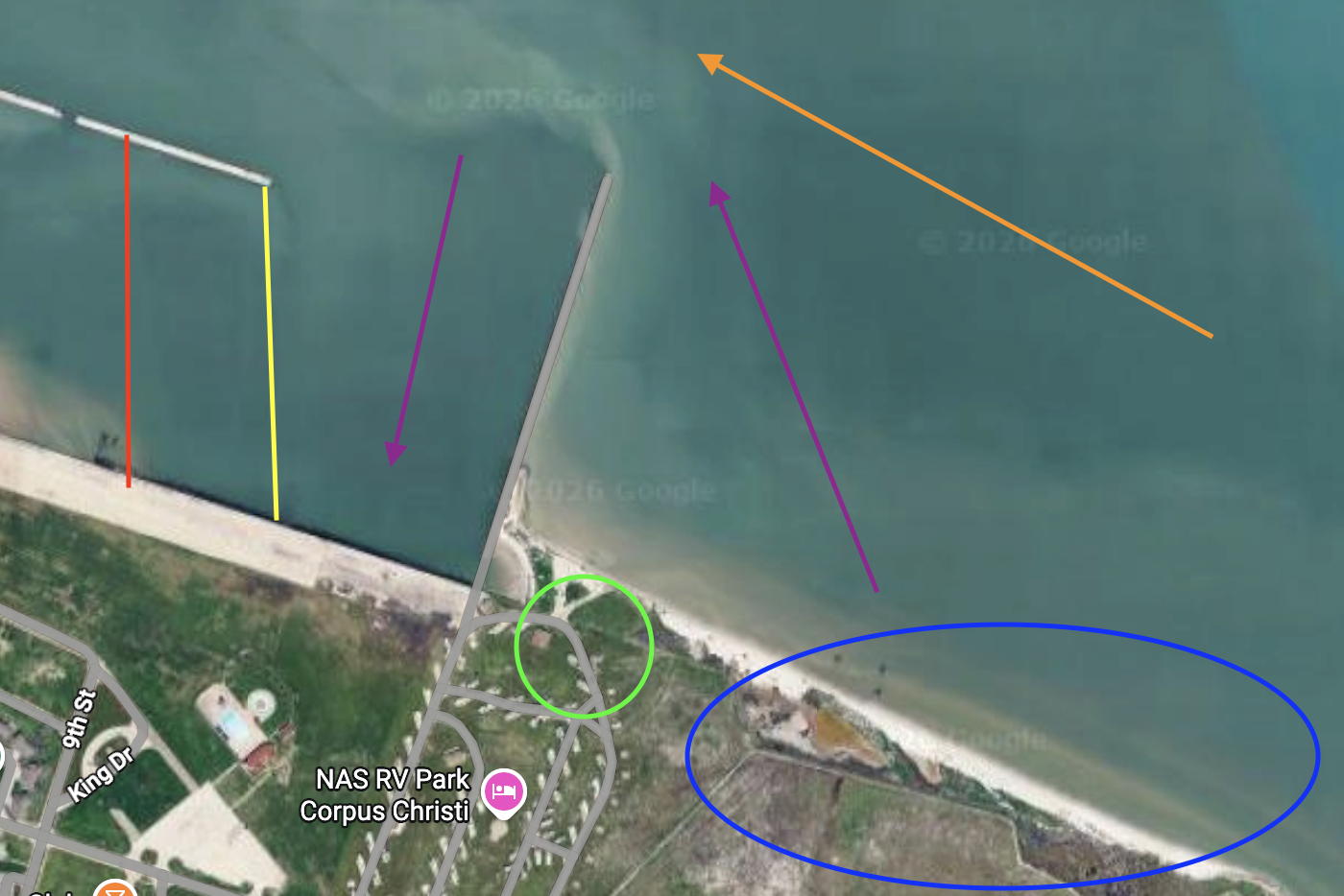This launch is in Portland. All of the launches in the Corpus area have their intricacies but this one especially. The launch is on a slope, and once the kite is launched, there is a significant walk around obstacles, fencing, rocks, and other kites entering and exiting the area. This is onshore on a south wind. Shallow water near shore, deep water the further from shore you go. Parking fills up quickly, and it can get busy with local wind sport enthusiasts.